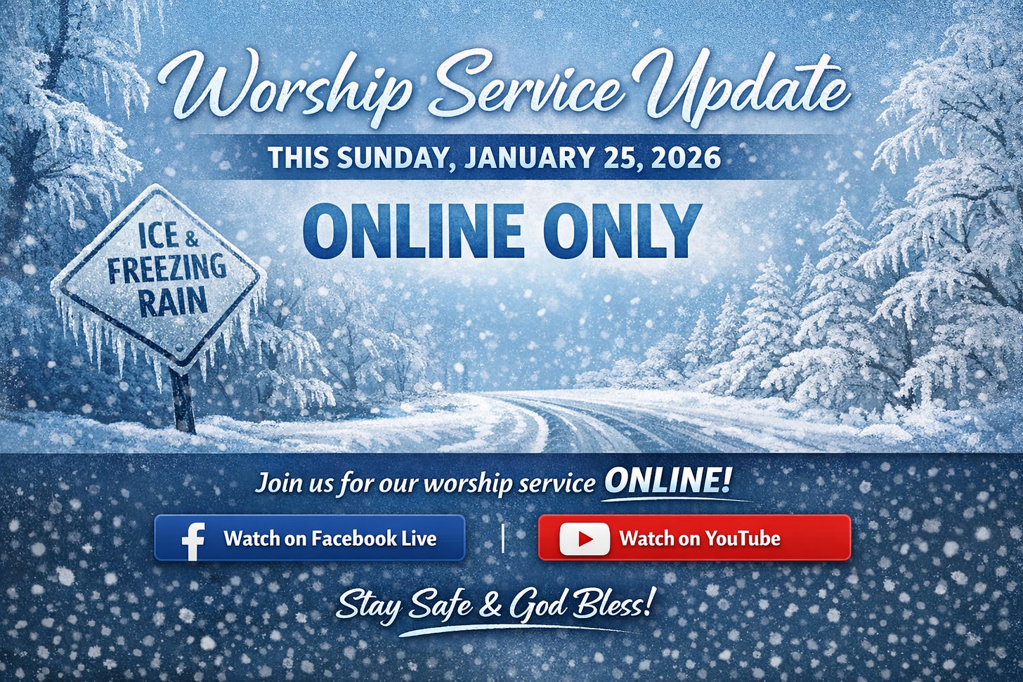 After prayerful consideration, the Elders and Session of Heritage Church have decided that, due to the impending and anticipated ice and freezing rain on the roads, our worship gathering for this Sunday, January 25, 2026, will be virtual only.